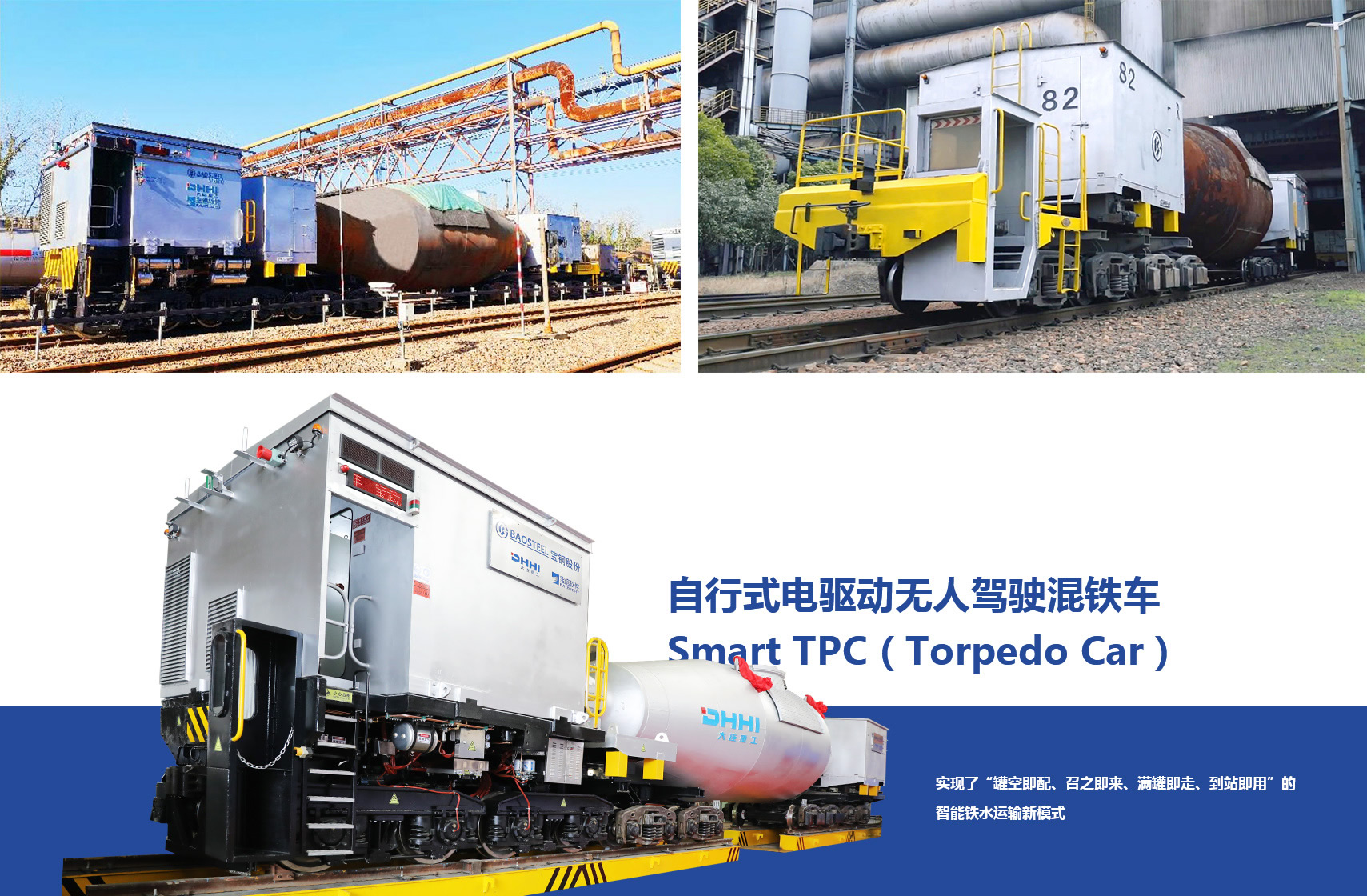 自行式電驅動無人駕駛混鐵車Smart TPC(Torpedo Car)是一種綠色、智能、高效的鐵水運輸設備,采用自動駕駛,純電力驅動,實現了“罐空即配、召之即來、滿罐即走、到站即用”的智能鐵水運輸新模式,可智能、綠色、高效地完成從高爐到煉鋼的鐵水運輸作業。